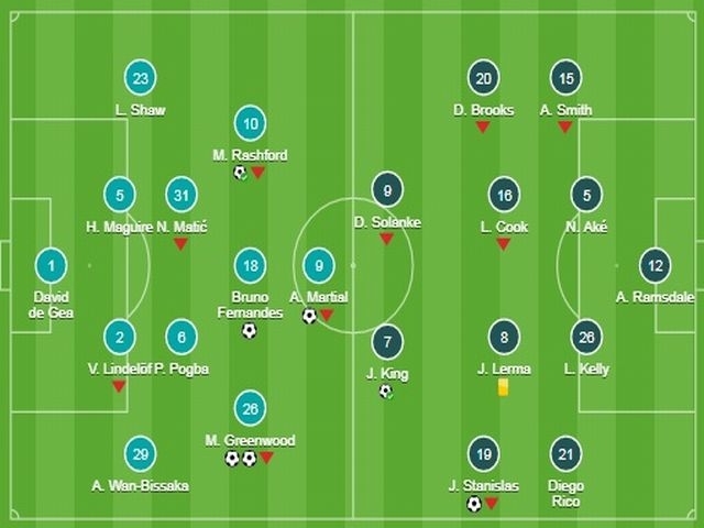 Малко след паузата Джошуа Кинг върна надеждите на гостите от дузпа, но Грийнууд охлади Борнемут с второто си красиво попадение днес, а преди изтичането на час игра се разписа и Бруно Фернандеш от фаул.