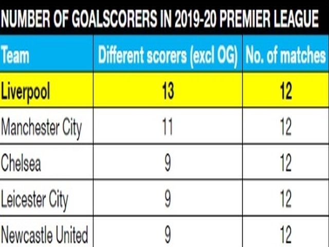 Тупалката на Фабиньо срещу "гражданите" преди дни го превърна в 13-ия футболист на Ливърпул, който се разписва в шампионата този сезон. За сравнение Сити има 11 различни реализатори, а с по девет са Челси, Лестър и Нюкасъл.