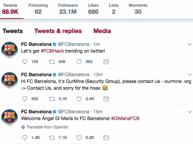 Официалният профил на каталунците в Twitter е бил пробит, след което се е появило следното съобщение: "Добро дошъл, Анхел Ди Мария, в Барселона", придружени с хаштаг #DiMariaFCB.