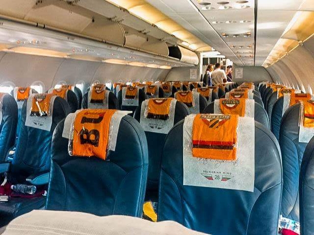 Малко след 12.00 часа, на влизане в самолета Airbus A319, на всяка една седалка имаше поставен специален подарък – шалче и знаме на най-стария български футболен клуб. Този приятен жест зарадва изключително много и над 60-те бултраси, които са близо до отбора в този така важен момент.