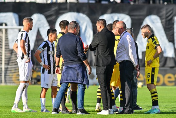 Напеченият мач приключи в 41-ата минута, след като вратарят на "жълто-черните" Даниел Наумов беше ударен с бутилка в главата.