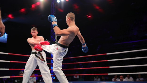 Сблъсъкът между двамата във варненската зала „Конгресна“ бе в категория до 75 кг по правилата на Професионалната лига на Световния киокушин съюз.