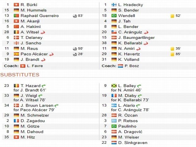 В 24-ата минута се стигна и до първата опасна ситуация, при която Лукас Храдецки спаси гостуващия отбор с невероятно двойно спасяване срещу Марко Ройс и доскорошния си съотборник Юлиан Брандт.