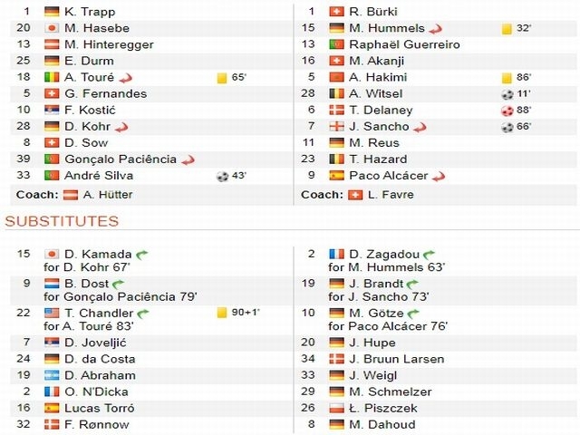 Франкфуртци заиграха по-смело след почивката и имаха своите възможности, но в средата на втората част Джейдън Санчо върна аванса на своите с попадение на празна врата. В 88-ата минута обаче Томас Дилейни си вкара автогол и рурци изпуснаха две важни точки в борбата за титлата.