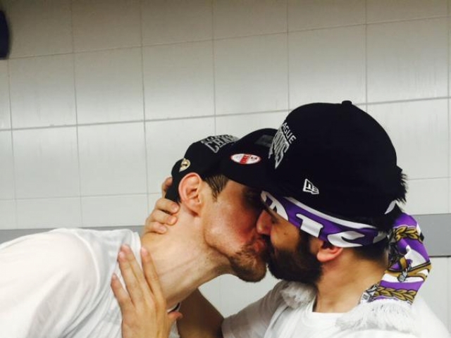 Двама от най-добрите състезатели на „белия балет“ - аржентинците Андрес Ночиони и Факундо Кампасо, се отдадоха на емоциите от успеха над Олимпиакос и започнаха да се целуват страстно по устата. Това е поредният подобен случай в мъжкия спорт, а каталунските медии не подмиха случая и веднага започнаха с хапливите закачки към големия съперник на Барселона.