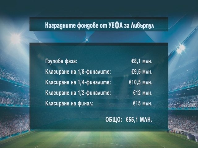 Гостът каза, че двата клуба ще получат над 50 милиона евро от УЕФА от наградни фондове. "В тази сума не влизат приходите от телевизионни права, рекламодатели и т.н. Мърсисайдци имат по-големи приходи от лондончани, защото записаха повече победи в груповата фаза на турнира", обясни Коларов.