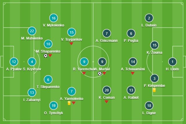 Точно когато изглеждаше, че нещата вървят към нулево реми на почивката, Украйна откри резултата чрез Микола Шапаренко, вкарал със страхотна тупалка. "Заслугата" беше на Антони Марсиал, който секунди по-рано изпорти чисто голово положение за гостите.