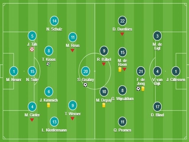 Горещите сцени продължаваха, защото реферът Артур Диас отсъди дузпа за Германия при много спорна двойна ситуация. Намиращият се на ръба на засадата Шулц получи в пеналта и не успя да центрира успешно, но при падането на топката във въздуха тя се спря в ръката на Де Лихт. Тони Кроос пое отговорността е вкара по земя от бялата точка в долния ляв ъгъл.