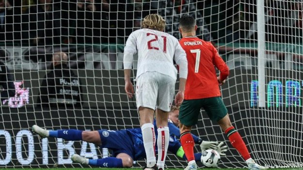 В 17-ата минута Роналдо с глава също не успя да матира датския голкийпър. Малко след това датчаните отговориха с удар на Хойлунд, отразен от Диого Коща.