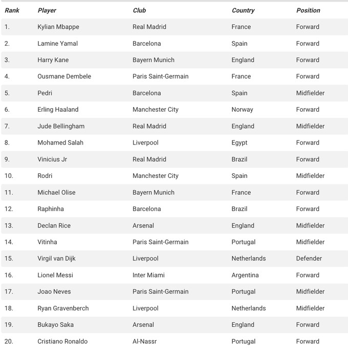Изгряващата звезда на Барселона Ламин Ямал отново е на второ място. Нападателят на Байерн Мюнхен Хари Кейн, който демонстрира постоянно отлична форма в Бундеслигата и в международен план, е трети.