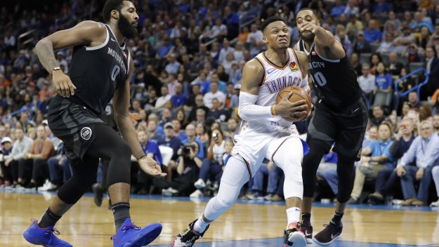 Суперзвездата на НБА и Оклахома Сити Ръсел Уестбрук си гарантира, че за трети пореден сезон ще има средно трипъл-дабъл на двубой, след като помогна за победата над Детройт със 123:110.